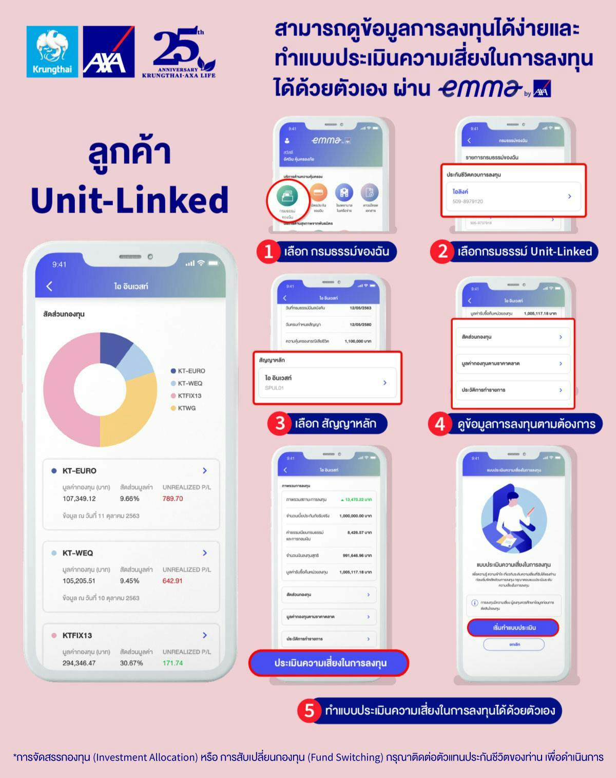 สำหรับลูกค้าผู้ถือกรมธรรม์ประกันชีวิตควบการลงทุน (Unit-Linked) อันได้แก่ iInvest iWealthy และ iLink สามารถดูรายละเอียดการลงทุนของคุณได้ง่ายๆ และทำแบบประเมินความเสี่ยงในการลงทุนได้ด้วยตัวเอง ผ่านแอปพลิเคชัน Emma by AXA